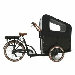 Bakfiets triporteur électrique TROY avec bac en bois 2 banquettes de 2 places (4 places) bâche de pluie avec fenêtre.