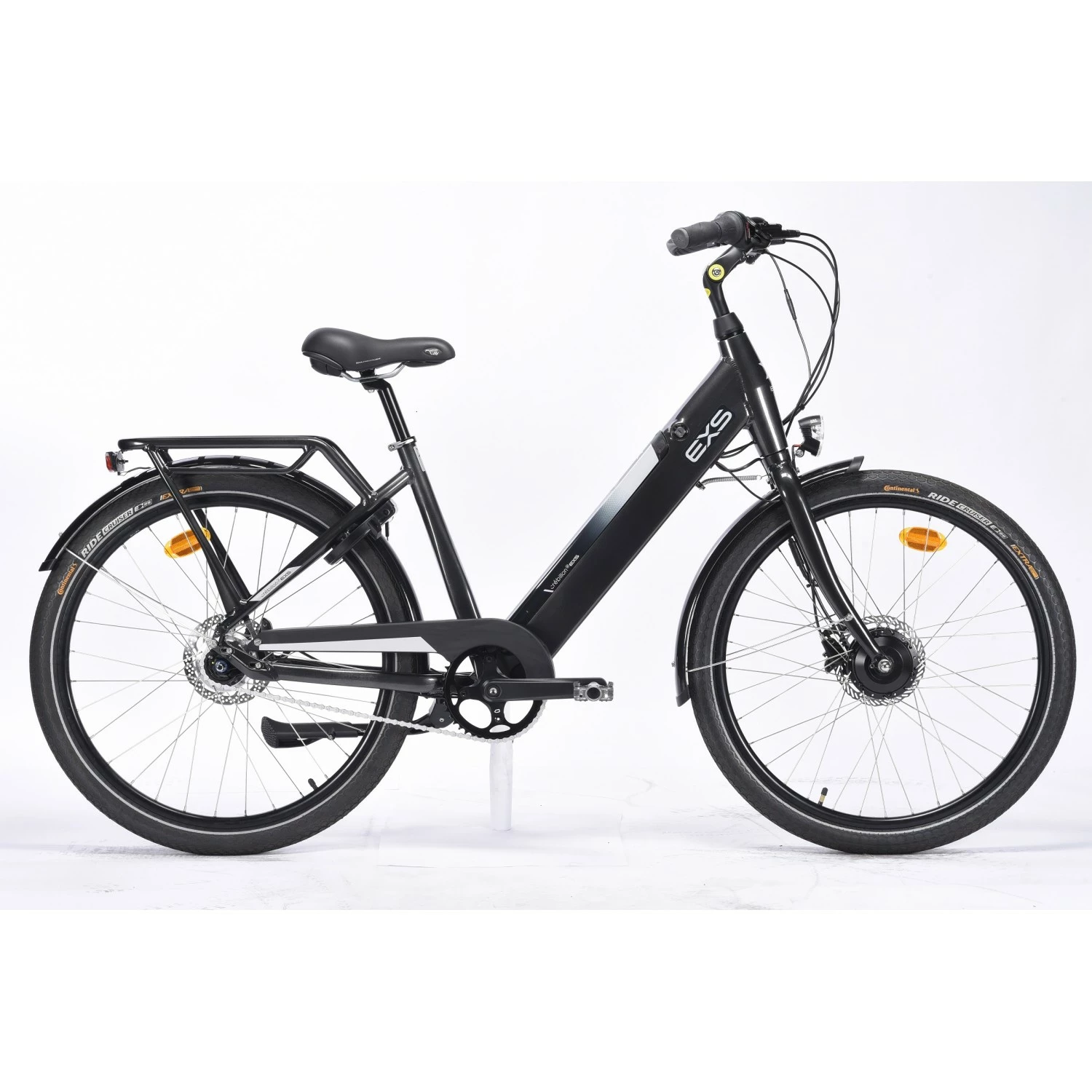 Le Crebillon de la marque Française EXS est Ă©quipĂ© d’un cadre en aluminium, d’une selle royale et de roues de 26 pouces.
