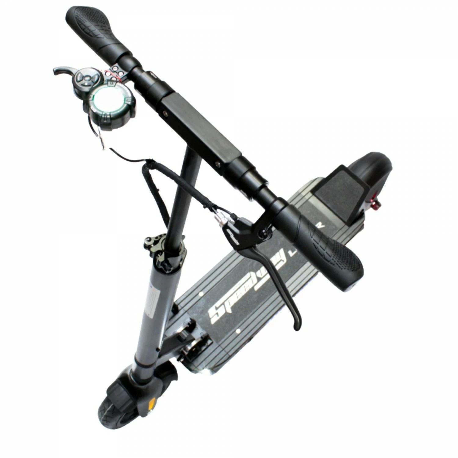 • Le display LCD multifonctions permet de visualiser la vitesse, sĂ©lectionner le mode de puissance, la distance parcourue et le kilomĂ©trage total. Le levier d’accĂ©lĂ©ration se trouve sur celui-ci.Â
