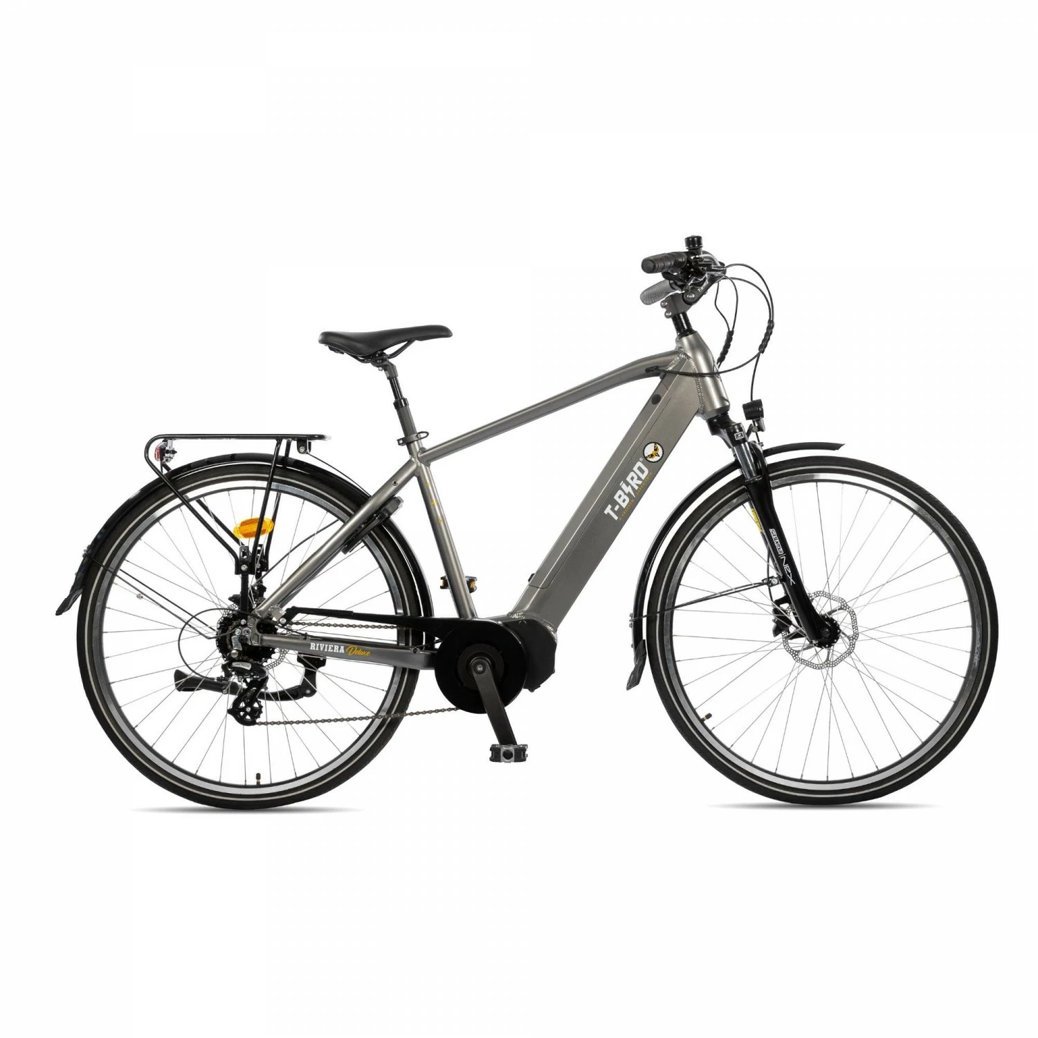 Le vĂ©lo Ă©lectrique Riviera Deluxe homme de la marque T-Bird est Ă©quipĂ© d’un moteur moteur pĂ©dalier de 80Nm.Â